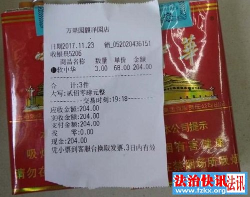 于是,24日早上9时许,就来到购买香烟的万果园便利店与收银员进行交涉,寻找当时向他出售香烟的5206号收银员当面对质,当日值班的一位女性收银员拒绝提供23日晚上值班收银员电话号码。 记者看到,李先生提供的两包软中华牌香烟包装盒颜色发暗,字迹重影,包装盒与当时万果园便利店柜台内的软中华烟相比,纸张较软。在万果园便利店提供的小票上显示:11月23日19点18分,软中华香烟3包,单价68元,总金额204元,销售单号052020436151,收银员为5206号。 在李先生与万果园人员交涉无果的情况下,拨打了烟草专卖品市场24小时值班电话12313,一位女性值班人员让与6068110联系。20多分钟后,周口市烟草专卖局稽查大队两名稽查人员来到涉事万果园便利店。他们查看过李先生提供的香烟和该店柜台内的软中华香烟后,说:“万果园还没有卖过假烟。”