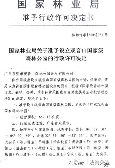 2005年国家林业局准予行政许可决定书,准予设立观音山国家级森林公园,定名为“广东观音山国家森林公园”,确定“经营面积:657.18公顷”,并认定了地理坐标和四界范围。同时确定了期限至:2049年11月30日。