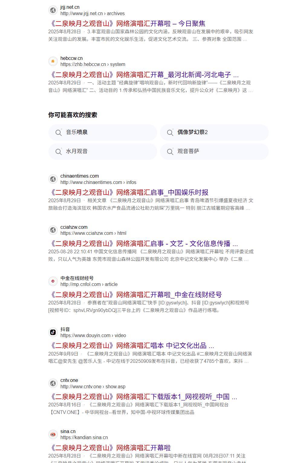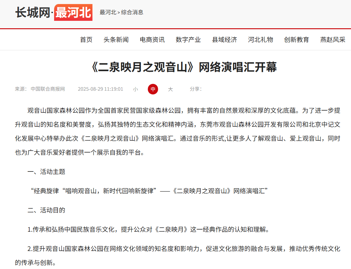 8月28日,“《二泉映月之观音山》网络演唱汇开幕啦”的消息见诸网络,包括《中国联合商报》、《长城网》、《中国娱乐时报》、《娱乐最前沿》等近千个网站。
