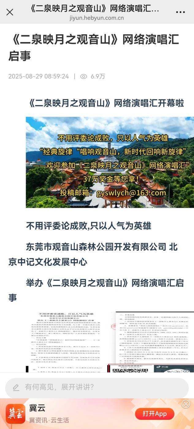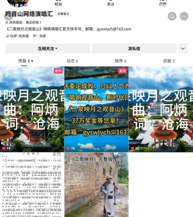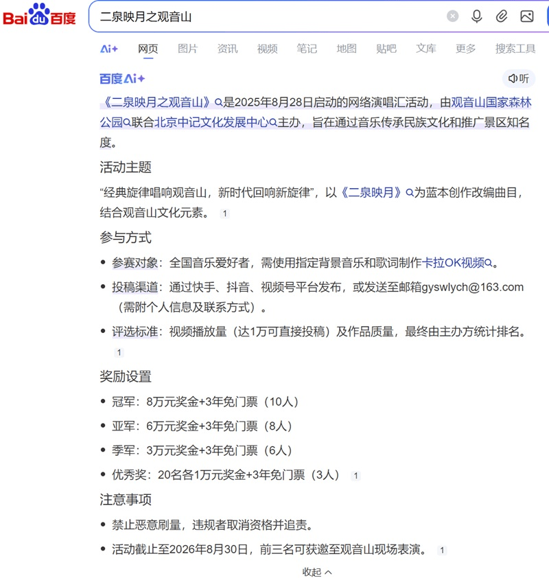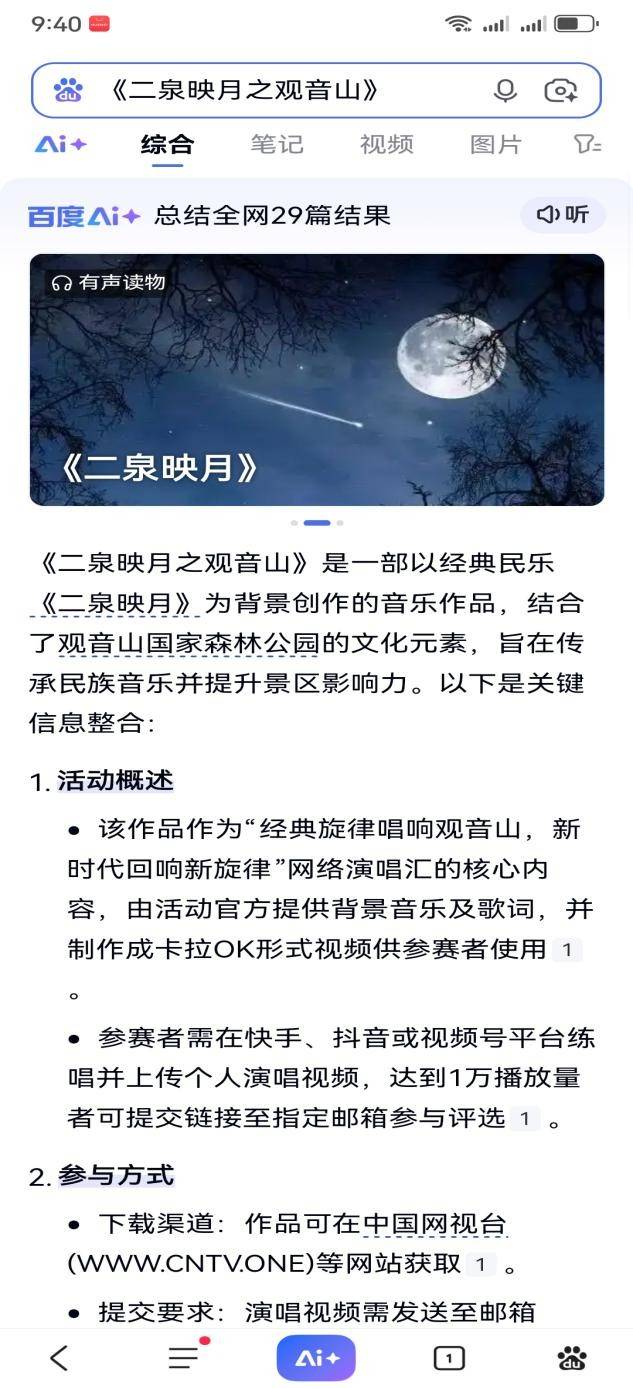 手机版百度AI的截图 《二泉映月之观音山》是由沧海作词,采用阿炳的二胡乐曲制作的卡拉OK形似的视频在抖音、快手、视频号平台播放,吸引音乐爱好者进行演唱。广东观音山国家森林公园和北京中记文化发展中心联合举办的“《二泉映月之观音山》网络演唱汇”设置了冠军、亚军、季军各一名和10名优秀奖,举办方拿出了37万元奖金和多份观音山门票进行奖励。 据悉,作词者沧海先生将演唱《二泉映月之观音山》并发布网络,相当期待《二泉映月之观音山》的众多演唱者视听版本现诸网络。 而用演唱经典歌曲进行生态保护的宣传在国内尚属首次,其心可鉴,其情可嘉,其意可展,其志可树。 |