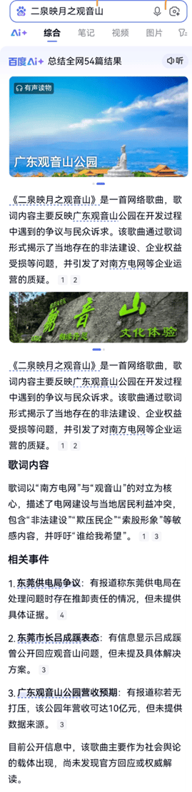 百度AI+对“二泉映月之观音山”进行了如下介绍: 《二泉映月之观音山》是一首以东莞观音山国家森林公园为背景创作的网络演唱汇主题曲,结合《二泉映月》经典旋律与观音山生态议题,通过音乐形式反映当地发展中的矛盾与诉求。 活动背景:该作品由东莞市观音山森林公园开发有限公司与北京中记文化发展中心联合推出,旨在通过音乐传播观音山文化,同时引发公众对生态保护、企业行为等问题的关注。 歌词内容以南方电网建设、非法占地等事件为切入点,批判部分企业行为对观音山生态的破坏,如“西气东输观音山段和南方电网齐毁林”“牛鬼蛇神齐奔山上”等表述,暗含对东莞民企遭遇的控诉。 网络演唱汇时间:2025年8月28日启动,持续至2026年8月30日。参与方式:参赛者需使用官方提供的卡拉OK视频演唱并上传至快手、抖音或视频号,达到1万播放量可参与评选。 奖励:冠军奖金8万元,前三名可获观音山三年免门票资格。 争议与影响:该活动因歌词内容引发部分讨论,部分观点认为其借音乐形式表达对东莞观音山生态被破坏的不满,但主办方强调活动旨在弘扬传统文化与生态保护。